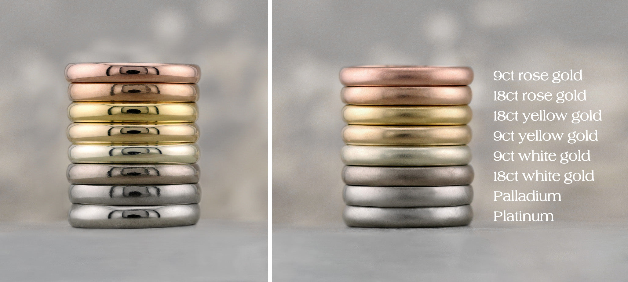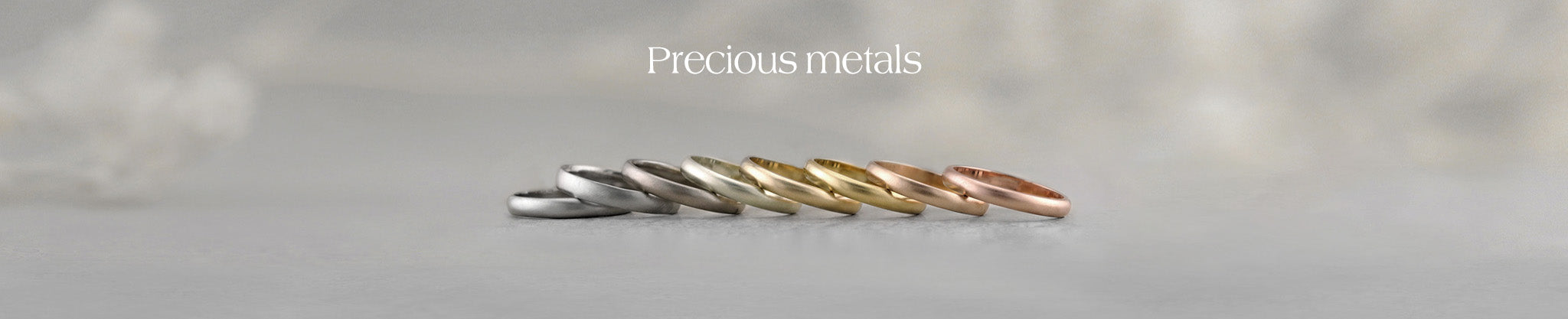 18ct white gold, 18ct yellow and rose gold, platinum, palladium, 9ct white gold, 9ct yellow and rose gold, silver.