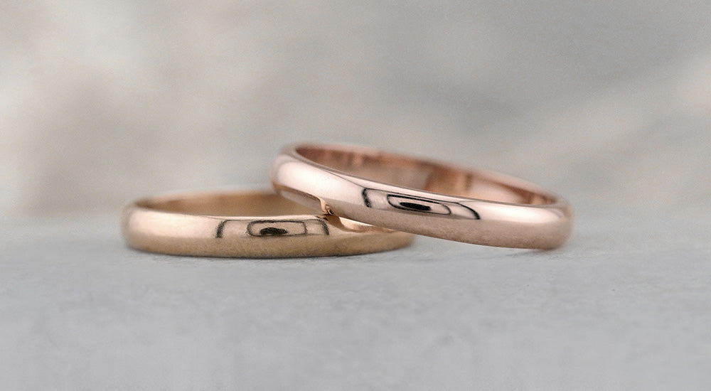 9ct rose gold (37.5% gold) is a stronger copper colour and slightly less durable than 18ct. 18ct rose gold (75% gold) is a slightly more yellowy-copper colour and more durable as it's also 50% denser. Rose gold rings wear at quite a similar rate and are usually chosen based on colour or purity preference.(Bespoke rings can also be made in 14ct rose gold).