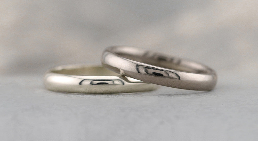 9ct white gold (37.5% gold) is light grey with a yellow tint, and less durable than 18ct. 18ct white gold (75% gold) is dark grey with an orange tint and is much harder than 9ct as it is alloyed with palladium, and more durable as it is 50% denser. (Bespoke rings can also be made in 14ct white gold).
