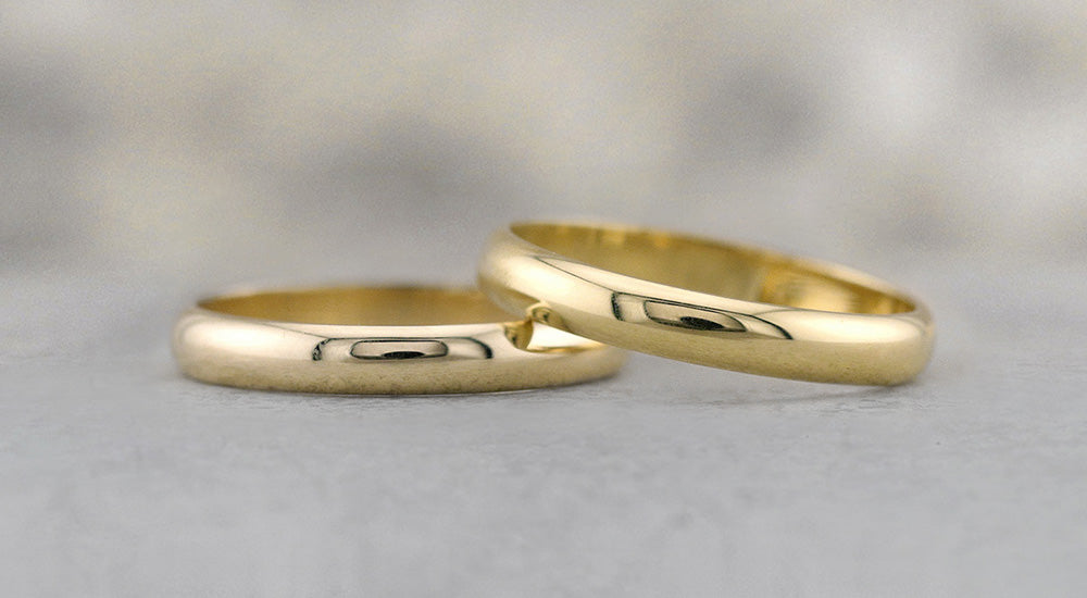9ct yellow gold (37.5% gold) is a subtle yellow colour and slightly less durable than 18ct. 18ct yellow gold (75% gold) is a stronger yellow gold colour and more durable as it's also 50% denser. Yellow gold rings wear at quite a similar rate and are usually chosen based on colour or purity preference. (Bespoke rings can also be made in 14ct yellow gold (58.5% gold) and 22ct yellow gold (91.6%).