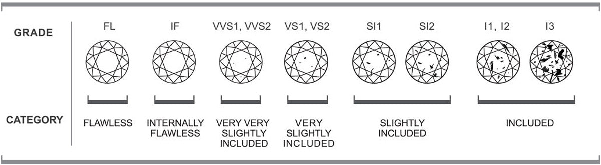 The GIA clarity scale has eleven clarity grades ranging from F (Flawless) to I3 (Included 3). Diamonds are formed under extreme heat and pressure, so it is very rare for a diamond to lack any inclusions. These natural inclusions and characteristics are used to identify natural diamonds and distinguish them from synthetics and simulants.