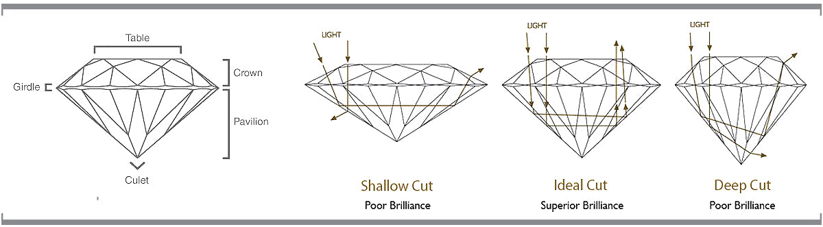 The GIA grades the cut of a diamond from excellent to poor. This scale considers the brightness, fire and scintillation of the diamond created by the cut. A well-cut diamond will achieve total internal reflection (TIR) so that no light escapes the stones and creates optimum brilliance.